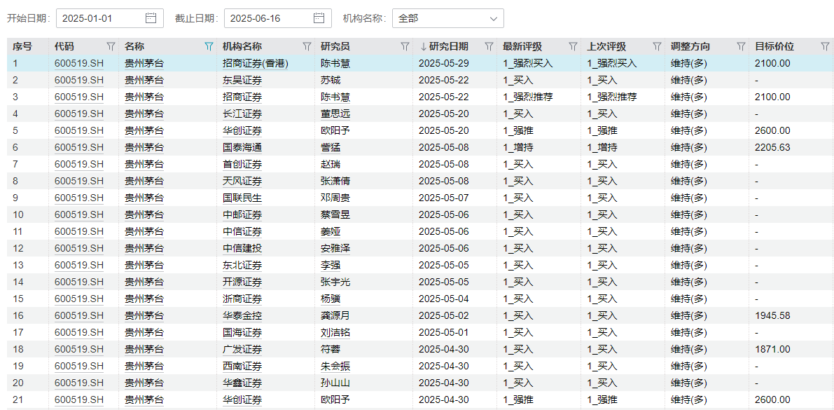 今年以来贵州茅台共获得92次评级,主要包括“买入”、“强推”、“增持”三大类,对比此前券商评级多维持不变。